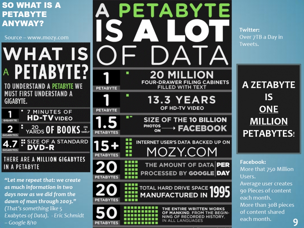 Mensen vragen zich wel eens af hoe groot het internet is. Via een snelle zoektocht op Google blijkt dat de vier grote bedrijven Microsoft, Google, Amazon en Facebook gezamenlijk ongeveer ï»ż1200 petabytes aan data bewaren. Dat alleen al is zo onvoorstelbaar veel. 1 petabyte is namelijk 13.3 jaar lang HD-TV video! Je kunt alle geschreven teksten in de menselijke geschiedenis opslaan in 20 petabytes! Zie ook het plaatje hieronder: