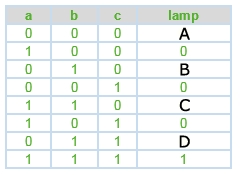 In onderstaand plaatje zie je schakeling met twee schakelaars en een lampje. Als beide schakelaars in positie 0 staat, brandt de lamp niet. Staan beide schakelaars in positie 1 dan brandt de lamp ook niet. De lamp brandt alleen als schakelaars in verschillende posities staan. Probeer maar. Kijk ook naar de getallen in de waarheidstabel.